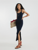 Our Navy Blue Ribbed Midi Dress with Side Slit offers a harmonious blend of comfort and elegance. Crafted from premium ribbed fabric, it provides a flattering, figure-hugging fit. The subtle side slit adds allure and ease of movement. Ideal for casual outings, brunch dates, or dressed up for evening gatherings.