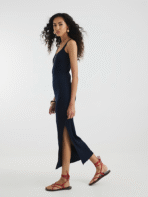 Sophisticated navy blue ribbed midi dress with a tasteful side slit for versatile elegance.