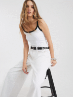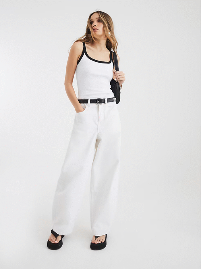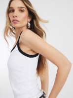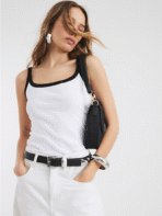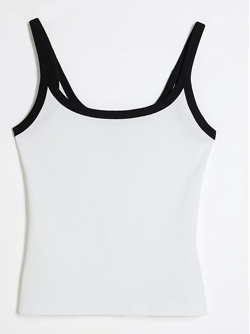 Trendy white tank top with bold black contrast detailing for effortless everyday style.